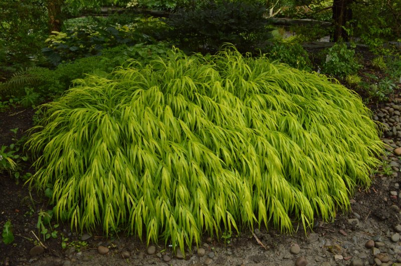 - Хаконехлоа «Олл Голд» – трава-многолетник, растущая в виде плотных холмиков из узких, золотистых листьев. Форма соцветия – метелка, цветки желтого окраса.