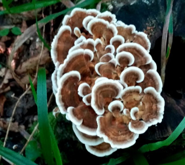 Молодые тонкие и кружевные плодовые тела, например, Траметеса разноцветного (Trametes versicolor), отколупнутые вместе с кусочком древесины, аналогично предыдущим описанным видам, подойдут для настольных моховых композиций. Может, и настенных – у кого насколько фантазии хватит.